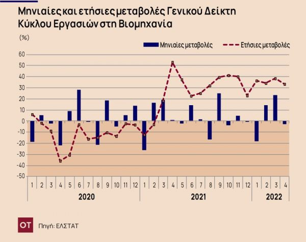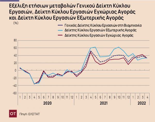Σύμφωνα με τα στοιχεία της ΕΛΣΤΑΤ, ο Γενικός Δείκτης Κύκλου Εργασιών στη Βιομηχανία (σύνολο εγχώριας και εξωτερικής αγοράς) του μηνός Απριλίου 2022, σε σύγκριση με τον αντίστοιχο δείκτη του Απριλίου 2021, παρουσίασε αύξηση 33,3% έναντι αύξησης 53,0% που σημειώθηκε κατά την αντίστοιχη σύγκριση του έτους 2021 με το 2020.