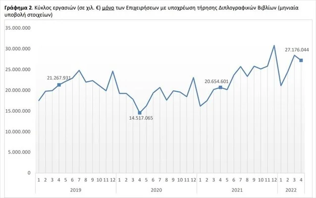 Στα 27,176 δισ. ευρώ ανήλθε ο κύκλος εργασιών των επιχειρήσεων με υποχρέωση τήρησης διπλογραφικών βιβλίων, για τις οποίες υπάρχουν διαθέσιμα στοιχεία σε μηνιαία βάση, σημειώνοντας αύξηση 31,6% σε σχέση με τον Απρίλιο 2021, οπότε και είχε διαμορφωθεί στα 20,65 δισ. ευρώ.