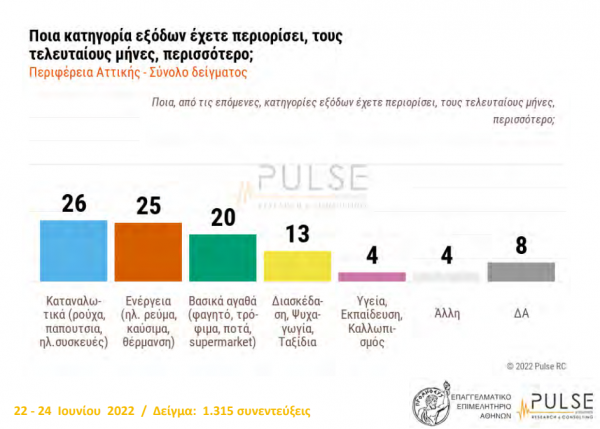– Ενέργεια (ηλεκτρικό ρεύμα, καύσιμα, θέρμανση) με σχεδόν έξι στους δέκα συμμετέχοντες και με τρεις στους δέκα, για βασικά αγαθά (φαγητό, τρόφιμα, ποτά, super market) να είναι οι δύο κατηγορίες εξόδων που προβληματίζουν σήμερα περισσότερο (έως «σχεδόν αποκλειστικά», αφού οι υπόλοιπες κατηγορίες καταγράφουν μονοψήφια ποσοστά) τα ελληνικά νοικοκυριά.