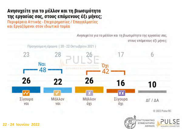 Συγκεκριμένα από την εξαμηνιαία διερεύνηση του γενικού πληθυσμού της Περιφέρειας Αττικής, από την Pulse RC σε συνεργασία και για λογαριασμό του Επαγγελματικού Επιμελητήριου Αθηνών, αναδεικνύονται τα εξής παρακάτω ευρήματα και συμπεράσματα: