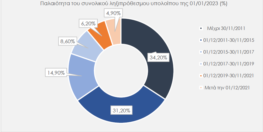 Η κατανομή του συνολικού ληξιπρόθεσμου ανάλογα με την περίοδο γέννησης της οφειλής στην οποία αφορά