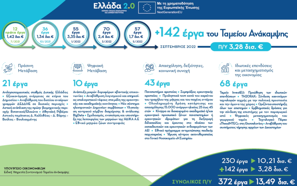 Στα 230 έργα, που είχαν ανακοινωθεί έως τον Μάιο του 2022, προστέθηκαν ακόμη 142 έργα, συνολικού προϋπολογισμού 3,28 δισ. ευρώ, τα οποία εντάχθηκαν στο «Ελλάδα 2.0», με αποφάσεις που υπέγραψε ο αρμόδιος για την υλοποίησή του, Αναπληρωτής Υπουργός Οικονομικών, κ. Θόδωρος Σκυλακάκης.