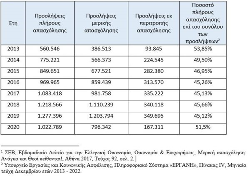 Η μεταβολή στη σύνθεση και τη φυσιογνωμία των εργασιακών σχέσεων, κατά τα έτη της οικονομικής κρίσης, εντοπίζεται με τον πλέον εμφατικό τρόπο, στην αναλογία μεταξύ αφενός της πλήρους και αφετέρου της μερικής και της εκ περιτροπής απασχόλησης, όπως προκύπτει από τα επίσημα στοιχεία του Π/Σ «ΕΡΓΑΝΗ» του Υπουργείου Εργασίας και Κοινωνικής Ασφάλισης για τα έτη 2013-2022 (Πίνακας):