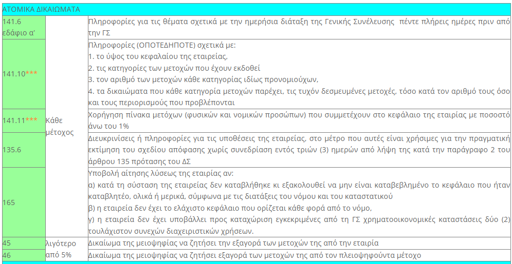 Εφόσον υπάρχει ρητή σχετική πρόβλεψη στο καταστατικό και φυσικά με την επιφύλαξη των διατάξεων για την προστασία των δεδομένων προσωπικού χαρακτήρα κάθε μέτοχος μπορεί να ζητήσει να του χορηγηθεί πίνακας από τον οποίο να προκύπτουν τα πρόσωπα, φυσικά και νομικά, που συμμετέχουν στο κεφάλαιο της εταιρίας με ποσοστό άνω του 1% (άρθρο 141 παράγραφος 11).