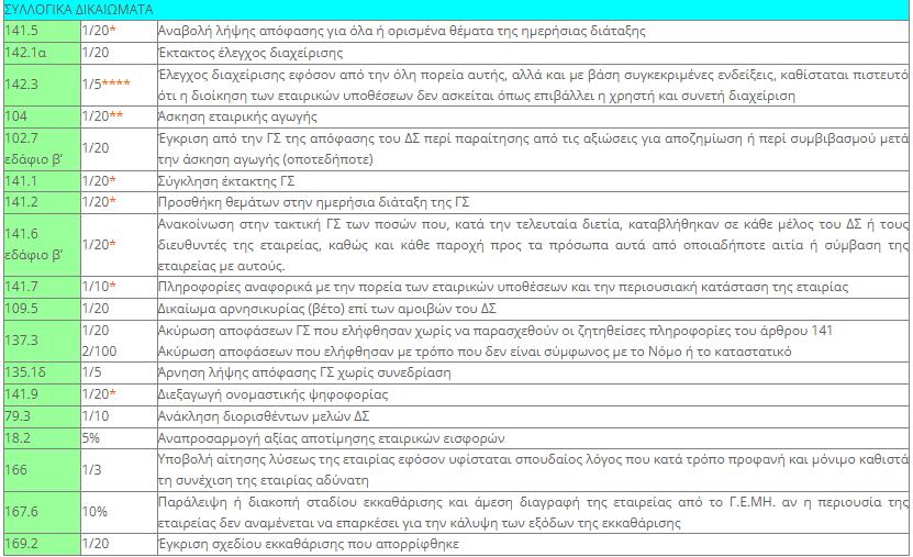 Σε πολυπρόσωπες ανώνυμες εταιρίες, συνιστάται ισχυρά όπως στο καταστατικό συμπεριλαμβάνεται ρητή πρόβλεψη ώστε η άσκηση από μέτοχο ή από ομάδα μετόχων που εκπροσωπεί συγκεκριμένο ποσοστό επί του καταβληθέντος κεφαλαίου, ενός ή περισσοτέρων από τα παρακάτω λεπτομερώς περιγραφόμενα δικαιώματα να εξαρτάται άμεσα και με ποινή ακυρότητας από τις προϋποθέσεις της παραγράφου 2 (ομοίως και των παραγράφων 3 και 4) του άρθρου 124, οι οποίες εφαρμόζονται κατ’ αναλογία. Σχετική ρητή πρόβλεψη στο ν. 4548/2018 υφίσταται μόνο για τα δικαιώματα της μειοψηφίας που περιγράφονται στο άρθρο 141.