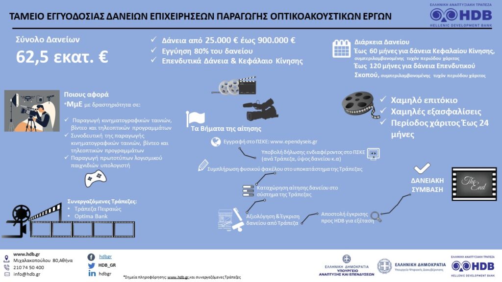 Το Ταμείο Εγγυοδοσίας Δανείων Επιχειρήσεων Παραγωγής Οπτικοακουστικών Έργων δημιουργήθηκε για να παρέχει εγγύηση σε δάνεια μέσω των συνεργαζόμενων Τραπεζών, προκειμένου να αποκτήσουν πρόσβαση στη χρηματοδότηση οι Μικρομεσαίες Επιχειρήσεις που δραστηριοποιούνται στον κλάδο παραγωγής οπτικοακουστικών έργων.