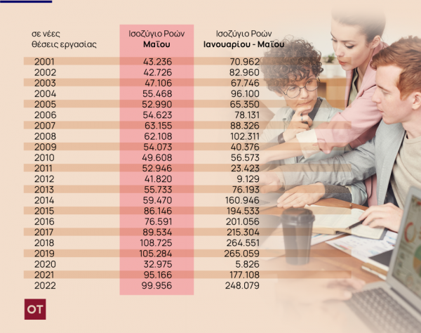 Η επίδοση του φετινού Μαΐου είναι η τρίτη καλύτερη της τελευταίας 20ετίας. Μόνο το 2018 με 108.725 θέσεις και το 2019 με 105.284 νέες θέσεις εργασίας καταγράφηκαν καλύτερες επιδόσεις. Επίσης, ο φετινός Μάιος είναι ο τέταρτος συνεχόμενος μήνας με θετικό ισοζύγιο προσλήψεων – απολύσεων.