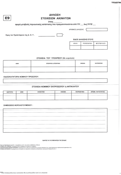 Δημοσιεύθηκε στο ΦΕΚ η απόφαση (Α.1035/2023) με τον τύπο και το περιεχόμενο της δήλωσης στοιχείων ακινήτων (Ε9) φυσικών και νομικών προσώπων έτους 2023 και επόμενων ετών.