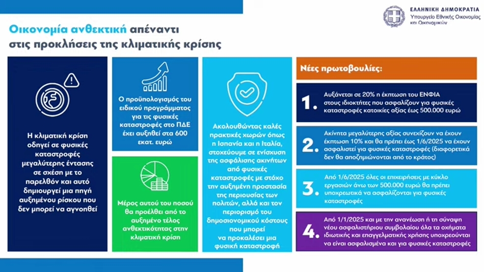 Αυξάνεται σε 20% η έκπτωση για τον ΕΝΦΙΑ σε ασφαλισμένες για φυσικές καταστροφές κατοικίες αξίας έως 500.000 ευρώ. Ακίνητα μεγαλύτερης από 500.000 ευρώ αξίας συνεχίζουν να έχουν την έκπτωση του 10% και θα πρέπει έως 01/06/2025 να έχουν ασφαλιστεί για φυσικές καταστροφές, διαφορετικά δεν θα αποζημιώνονται από το κράτος.