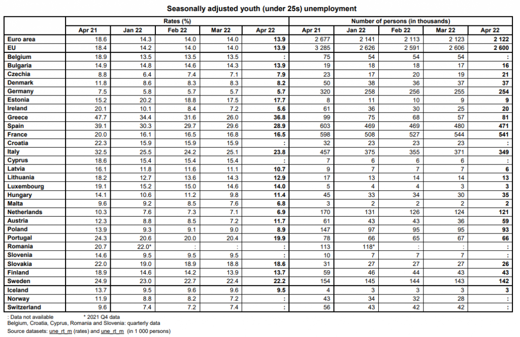 Την ίδια στιγμή, η χώρα αναδεικνύεται πρωταθλήτρια Ευρώπης στην ανεργία των νέων, καταγράφοντας ποσοστό 36,8% τον Απρίλιο, από 26% τον Μάρτιο, 31,6% τον Φεβρουάριο και 34,4% τον Ιανουάριο.