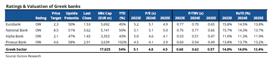 Κατά μέσο όρο, οι ελληνικές τράπεζες διαπραγματεύονται με 5,1x σε όρους P/E με βάση τις εκτιμήσεις του 2023, με discount περίπου 15% σε σχέση με τον ευρωπαϊκό κλάδο (SX7E σε περίπου 6x P/E).