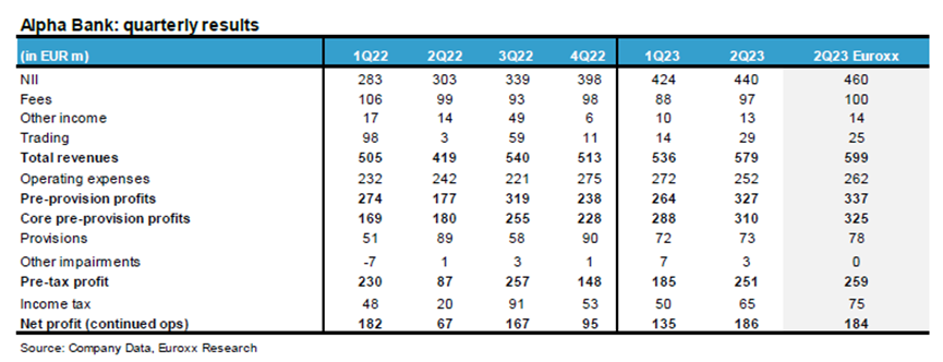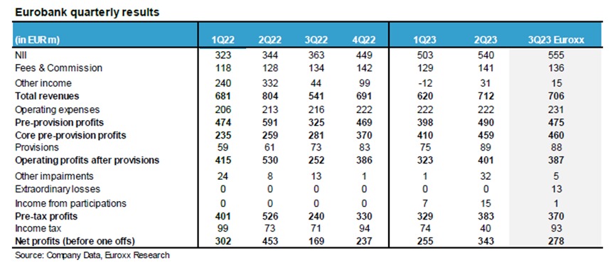 Υπενθυμίζεται εδώ ότι η Alpha Bank και η Πειραιώς ανακοινώνουν αποτελέσματα την Παρασκευή 3 Νοεμβρίου πριν ανοίξει, η Eurobank ανακοινώνει την Παρασκευή 7 Νοεμβρίου μετά το κλείσιμο της αγοράς, ενώ η Εθνική δεν έχει ανακοινώσει ακόμη την ημερομηνία (πιθανή ημερομηνία τη δεύτερη εβδομάδα του Νοεμβρίου). Οι εκτιμήσεις της Euroxx για τα μεγέθη: