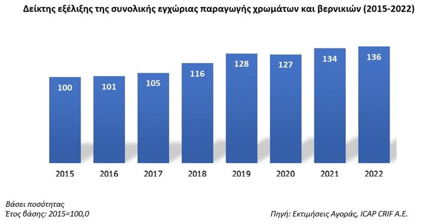 H Σταματίνα Παντελαίου, Διευθύντρια Οικονομικών & Κλαδικών Μελετών της ICAP CRIF αναφέρει ότι η συνολική εγχώρια παραγωγή των οικοδομικών χρωμάτων και βερνικιών επιπλοποιίας ακολουθεί ανοδική πορεία (με εξαίρεση το 2020) την περίοδο 2015-2022, εμφανίζοντας μέσο ετήσιο ρυθμό αύξησης 4,5%. Σημειώνεται ότι ο ρυθμός αύξησης την περίοδο 2019/18 (+9,6%) ήταν ελαφρώς χαμηλότερος σε σύγκριση με τον ρυθμό αύξησης της προηγούμενης περιόδου 2018/17 (+10,7%). Η εμφάνιση της πανδημίας COVID-19 τον Φεβρουάριο του 2020 και στην χώρα μας και οι απαγορεύσεις που επιβλήθηκαν για τον περιορισμό της εξάπλωσής του από τον Μάρτιο του ίδιου έτους, είχαν περιορισμένες επιπτώσεις στον κλάδο των χρωμάτων – βερνικιών (αναβολή εκτέλεσης έργων, καθυστερήσεις στα εν εξελίξει έργα, αναστολή λειτουργίας των χρωματοπωλείων, μετάβαση από μεγάλες σε μικρές συσκευασίες λόγω αύξησης της οικιακής χρήσης στα lockdowns, κ.ά.) ανακόπτοντας προσωρινά την ανοδική πορεία των προηγούμενων ετών. Συγκεκριμένα η εγχώρια παραγωγή παρουσίασε κατέγραψε οριακή μείωση 0,8% το 2020 έναντι του 2019. Το 2021, η παραγωγή οικοδομικών χρωμάτων και βερνικιών επιπλοποιίας επανέρχεται σε ανοδική τροχιά, σημειώνοντας αύξηση 5,6%. Μικρή αύξηση 1,5% εκτιμάται ότι εμφάνισε η αγορά και το 2022. Οι εταιρείες του κλάδου που αποσπούν τα μεγαλύτερα μερίδια παραγωγής είναι οι VIVECHROM ΔΡ ΣΤ. Δ. ΠΑΤΕΡΑΣ Α.Ε., VITEX Α.Ε. και ΒΕΧΡΩ Α.Ε.
