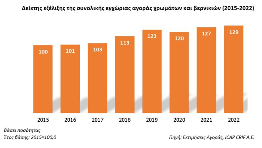 Σύμφωνα με όσα αναφέρει η Ελευθερία Παραμερίτη, Manager της Διεύθυνσης Οικονομικών – Κλαδικών Μελετών της ICAP CRIF, η οποία επιμελήθηκε την εν λόγω μελέτη, η εγχώρια αγορά χρωμάτων και βερνικιών οικοδομής και επιπλοποιίας ακολούθησε συνεχόμενα ανοδική πορεία την περίοδο 2015-2019, με μέσο ετήσιο ρυθμό αύξησης 5,3%. Τη διετία 2016-2017 το μέγεθος της εγχώριας αγοράς των εξεταζόμενων προϊόντων παρουσίασε μικρή αύξηση 1% με 2%. Το 2018 παρουσίασε τον υψηλότερο ετήσιο ρυθμό αύξησης της εξεταζόμενης περιόδου (9,8%) σημειώνοντας άνοδο 8,5% έναντι του 2018. Τους πρώτους μήνες του 2020 (Ιανουάριο-Φεβρουάριο) η εγχώρια αγορά συνέχισε να κινείται σε θετικούς ρυθμούς σε σχέση με το αντίστοιχο διάστημα του 2019. Ωστόσο, η εμφάνιση της πανδημίας COVID-19 με τις επιπτώσεις της να γίνονται εμφανείς την περίοδο Απριλίου – Μαΐου (αναβολή/ ακύρωση εκτέλεσης έργων, καθυστερήσεις στα εν εξελίξει έργα, μειωμένη ζήτηση λόγω της αναστολής λειτουργίας των χρωματοπωλείων, κ.ά.), εκτιμάται ότι ανέκοψε προσωρινά τη θετική πορεία της εγχώριας κατανάλωσης που κατέγραψε μικρή μείωση 2,6%. Το 2021 η αγορά επανήλθε σε ανοδική τροχιά σημειώνοντας αύξηση 5,9%, ενώ το 2022 εκτιμάται ότι παρουσίασε περαιτέρω άνοδο με μικρότερο όμως ρυθμό (1,8%).